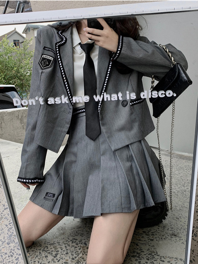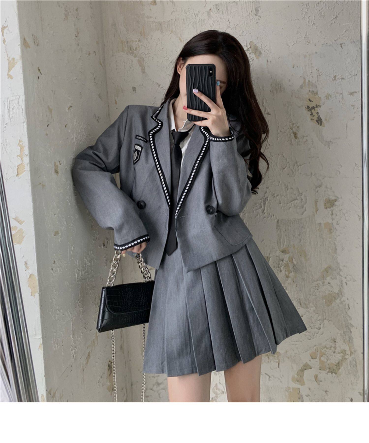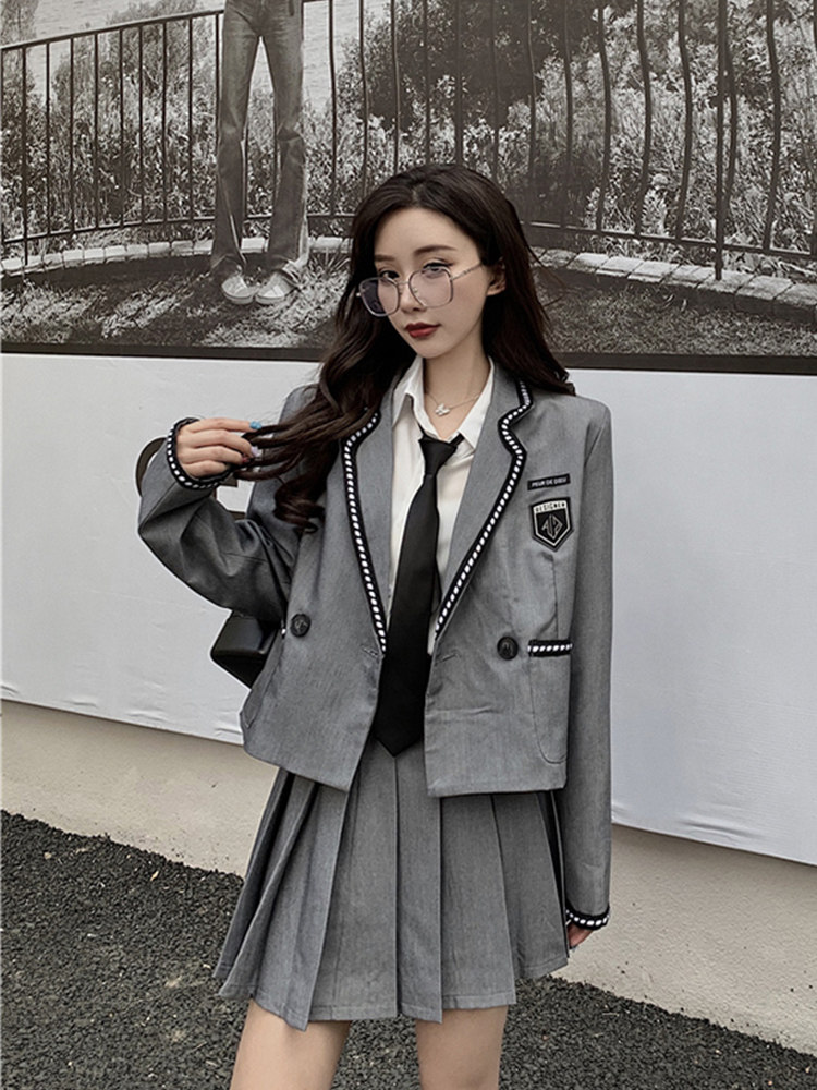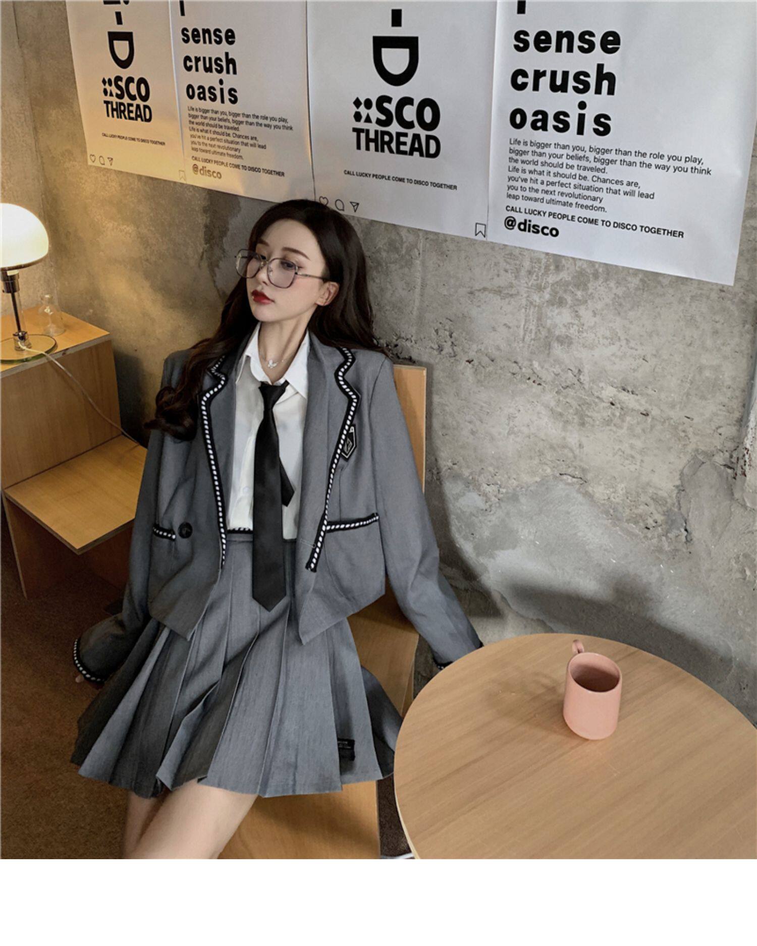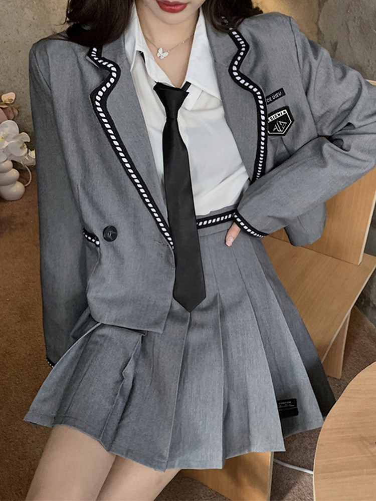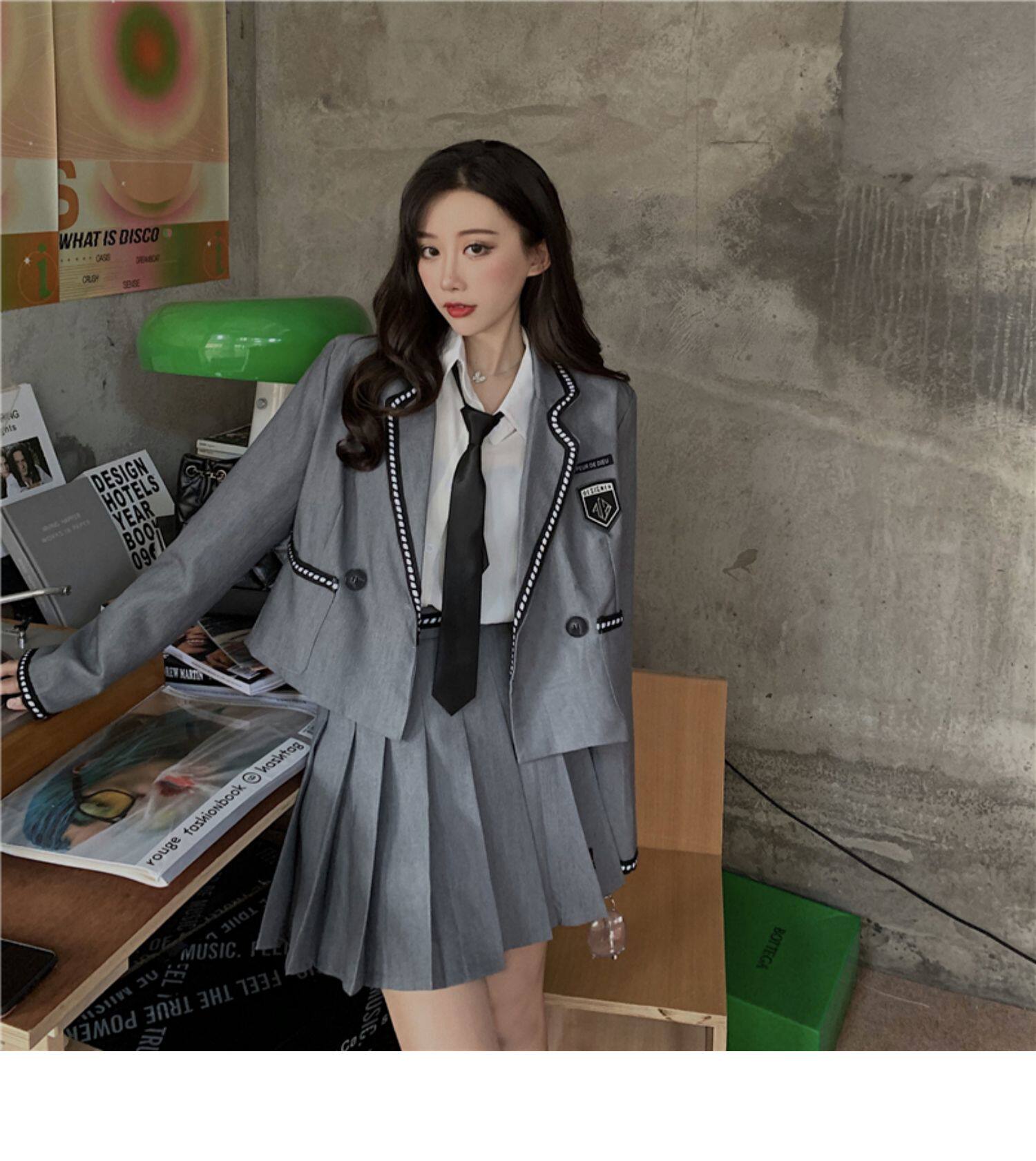 ショート丈のジャケットとプリーツスカート、ネクタイがセットになっており、学生らしい清潔感とモダンな雰囲気を兼ね備えた一着です。