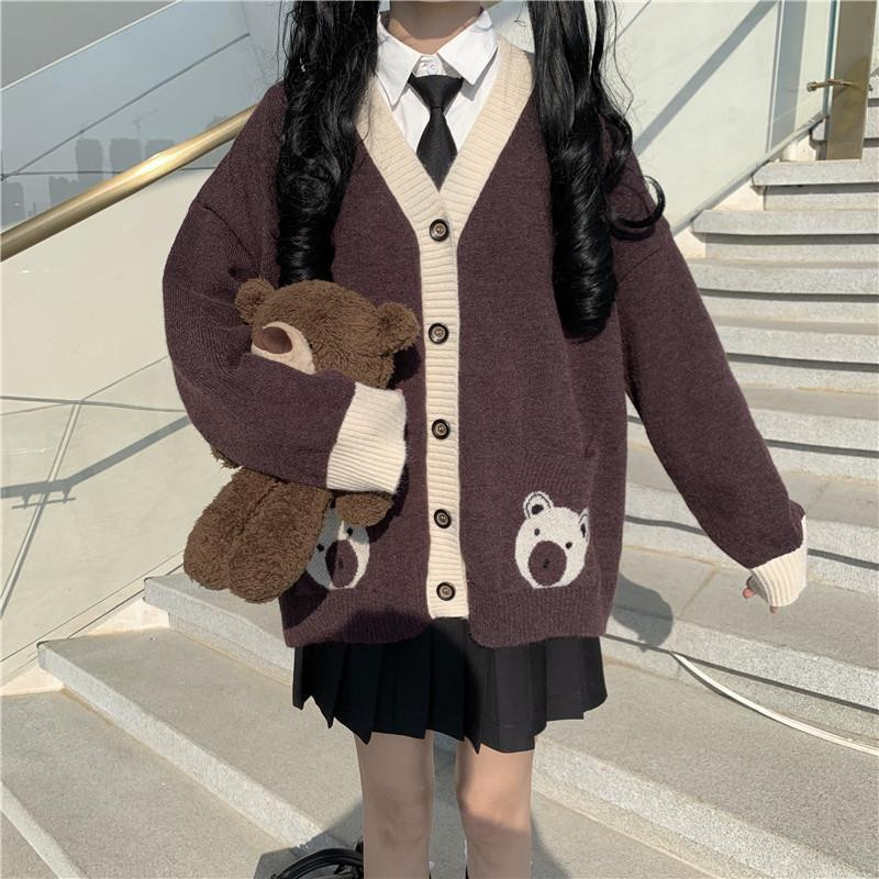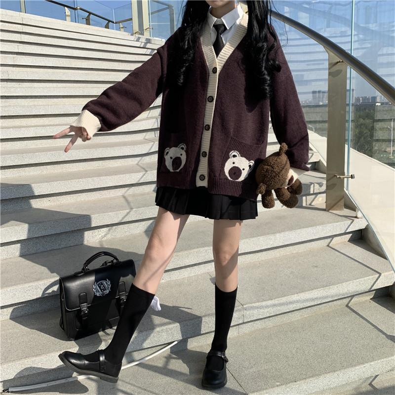 茶色のくまさん刺繍がポケット部分に施され、配色デザインが特徴的な前開きカーディガンに白シャツ、ネクタイ、プリーツスカートがセットになっています。